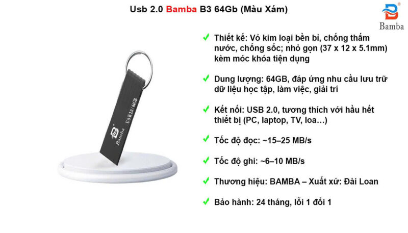 Thời gian bảo hành: 24 THÁNG Lỗi 1 đổi 1 Thương hiệu : BAMBA – Chuẩn kết nối : USB 2.0 – Chất liệu : Kim loại – Size : 37 x 12 x 5.1mm – Dung lượng : 64Gb – Xuất xứ : Đài Loan
