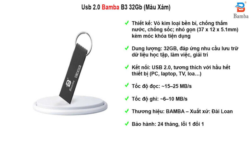 Thời gian bảo hành: 24 THÁNG Lỗi 1 đổi 1 Thương hiệu : BAMBA – Chuẩn kết nối : USB 2.0 – Chất liệu : Kim loại – Size : 37 x 12 x 5.1mm – Dung lượng : 32Gb – Xuất xứ : Đài Loan